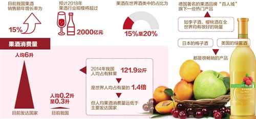 荔枝酒、楊梅酒、桑椹酒、五味子酒、藍(lán)莓酒、蘋(píng)果酒……隨著人們健康消費(fèi)意識(shí)的提升,如今以葡萄酒為代表的果酒產(chǎn)業(yè)正迎來(lái)新的發(fā)展機(jī)遇期。《2014年至2018年中國(guó)果酒研究報(bào)告》顯示,目前我國(guó)果酒銷(xiāo)售額年增長(zhǎng)率為15%,預(yù)計(jì)2018年果酒行業(yè)規(guī)模將超過(guò)2000億元。