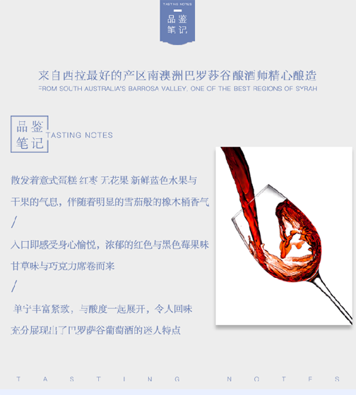 香氣 :?散發(fā)著意式蛋糕、紅棗、無花果、新鮮藍色水果與干果的氣息,伴隨著明顯的雪茄般的橡木桶香氣