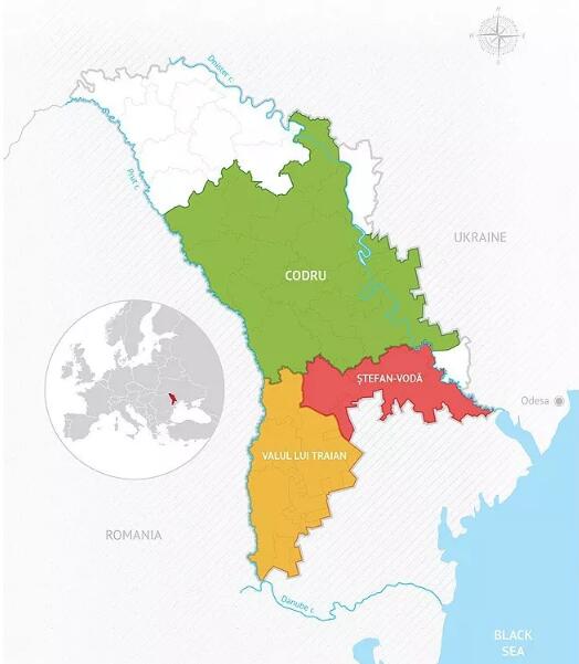 摩爾多瓦的國土面積跟我國的海南省(35400平方公里)差不多大,但是有著超過五千年的釀酒歷史。對于葡萄種植,擁有著得天獨厚的地理和氣候條件。摩爾多瓦絕大部分葡萄園位于北緯46°和47°之間,肥沃的黑鈣土地,遍布全國的丘陵、谷地提供了優(yōu)質(zhì)的斜坡,同時還有南部的黑海調(diào)節(jié)氣候。摩爾多瓦的大部分國土都適宜種植葡萄,一共被分成4個產(chǎn)區(qū):Valul lui Traian產(chǎn)區(qū)(西南部)、Stenfan Voda產(chǎn)區(qū)(東南部)、Codru產(chǎn)區(qū)(中部)和Divin迪文(全國)。
