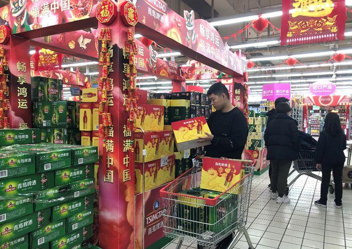 “青島啤酒作為知名的酒水品牌,像經(jīng)典1903、純生、奧古特、鴻運(yùn)當(dāng)頭等基本上都不需要多做介紹,顧客就非常熟悉了。尤其春節(jié)期間,鴻運(yùn)當(dāng)頭、奧古特等中高端產(chǎn)品格外受青睞,有些顧客來(lái)到以后,提起來(lái)就往購(gòu)物車(chē)?yán)锓拧保坛ぷ魅藛T高先生介紹。