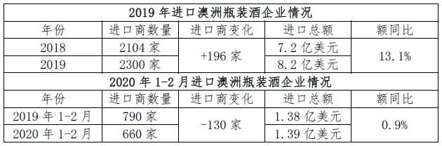 今年1-2月,盡管疫情對行業有一定沖擊,但澳洲瓶裝酒進口頭部企業基本穩住陣腳。雖然進口額≥1000萬美元的企業僅1家,少于去年同期,但其進口額同比增長近30%;而進口額≥500萬但小于1000萬美元的企業有2家,數量增加,其中,1家進口額實現倍數增長,1家為新的行業進入者。