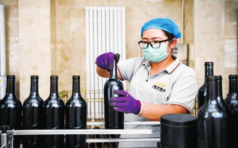 近年來,寧夏大力推進葡萄酒產業發展,走出了一條葡萄酒產業與文化旅游產業融合發展之路。截至2019年底,寧夏葡萄種植面積達到57萬畝,現有酒莊211家,產業綜合產值達260億元。圖為寧夏志輝源石酒莊工作人員在葡萄酒生產線上忙碌。