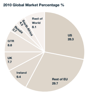歐洲方面。2010年,愛爾蘭威士忌主要銷往歐洲(占比51%),十年后,歐洲在愛爾蘭威士忌全球市場的份額已回落至37%。盡管份額變小,但愛爾蘭威士忌在整個歐洲大陸還是強勁增長了十年。雖然在西歐市場的銷量增長緩慢,但在中歐和東歐市場表現較好。俄羅斯、德國、波蘭、捷克和烏克蘭在這十年中以略高于20%的銷量增速遙遙領先。2019年,在中歐/東歐銷售了超過35萬箱,占2019年總銷量的31%。就愛爾蘭威士忌品牌之間的競爭而言,德國已成為愛爾蘭威士忌最具競爭力的主要市場:與競爭對手品牌相比,愛爾蘭威士忌類領先品牌(33%)的市場份額最低。